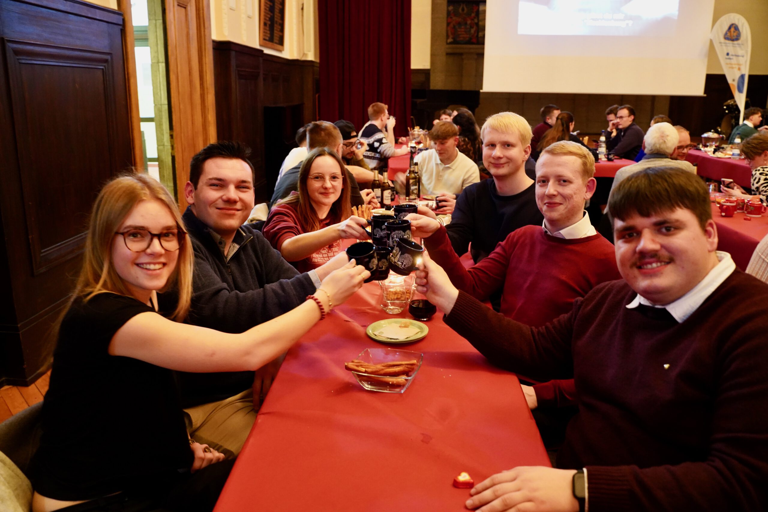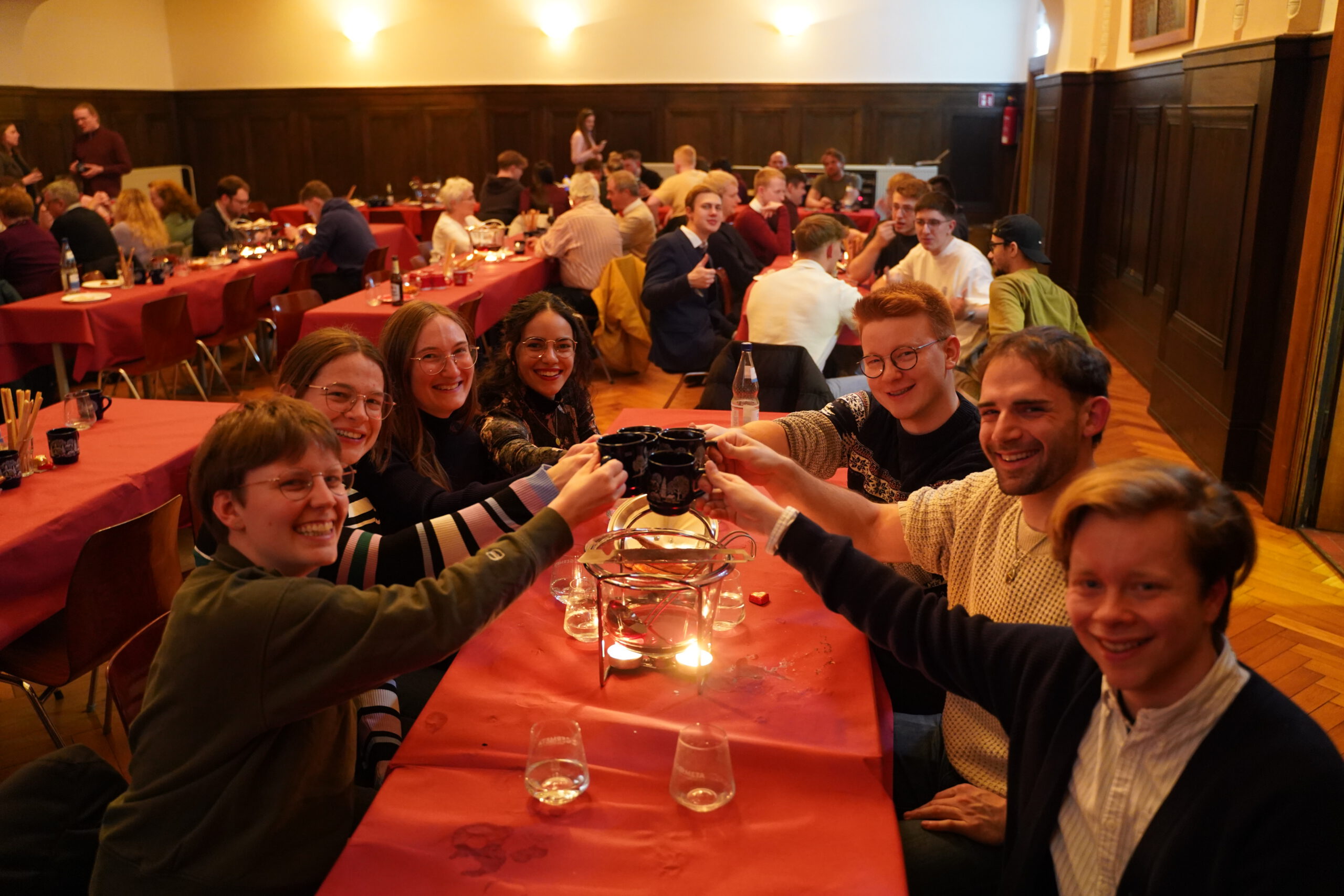 Die Atmosphäre in der festlich hergerichteten Aula war wie gewohnt magisch: Während auf der Leinwand Heinz Rühmann als Hans Pfeiffer seine Schülerschwänke trieb, brodelte es auf den Tischen im Saal ganz real. In gemütlichen Runden beobachteten die Gäste, wie der Rum über die Zuckerhüte gegossen wurde und die bläulichen Flammen das Traditionsgetränk zum Leben erweckten.