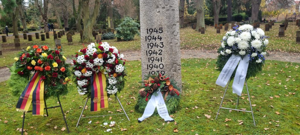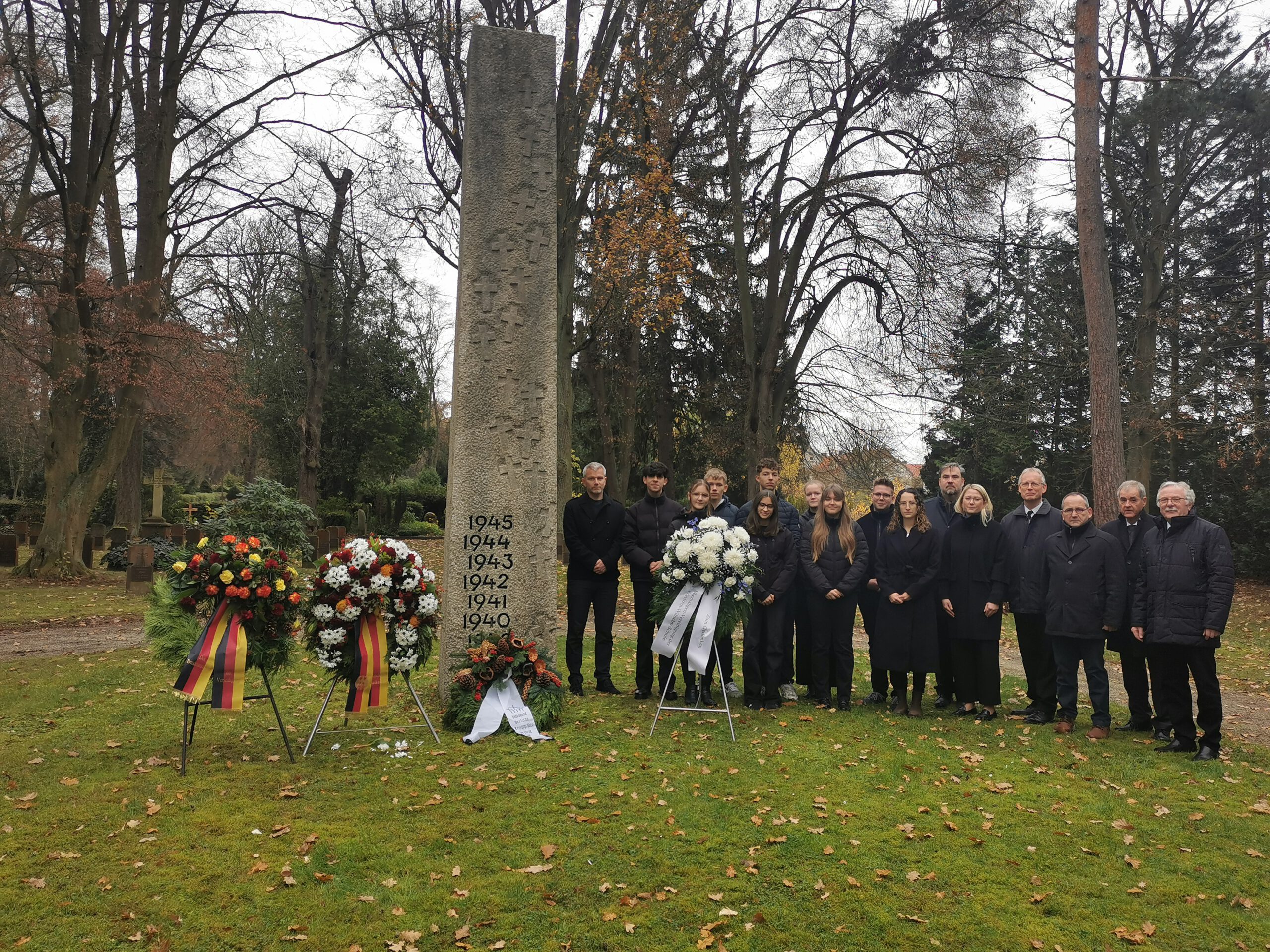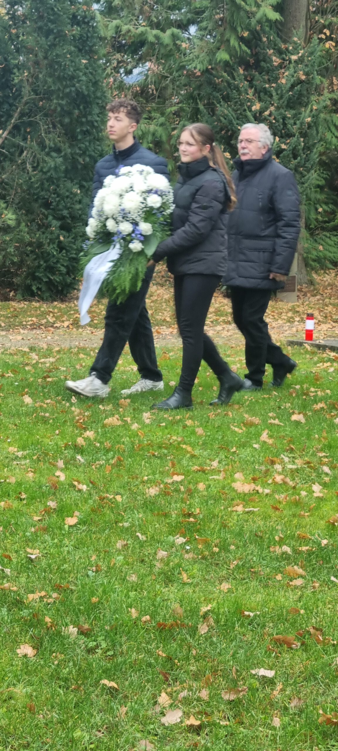 Nach der Rede verlasen unsere SV-Mitglieder Malte Degenhardt und Clara Sander langer Tradition folgend die Namen der 23 Friedrich-Wilhelm-Schüler, die am 03. Oktober 1943 in Kassel-Sandershausen ihr Leben verloren. Am Ende der Gedenkfeier legten Yves Finn Haddad und Josephine Brenk in Begleitung von Herrn Degenhardt und Herrn Dölle den Kranz der Ehemaligen-Vereinigung der Friedrich-Wilhelm-Schule und der Eschweger Gymnasien am Ehrenmal nieder. SV der FWS